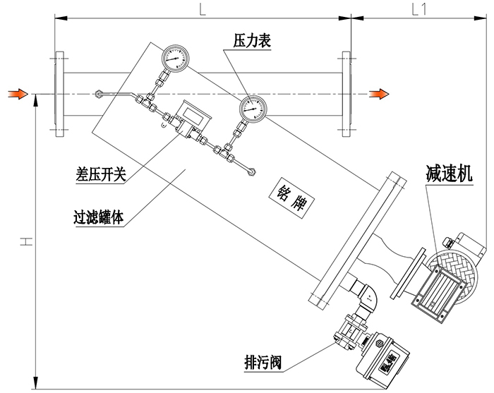 S系列自清洗过滤器是一种全自动自清洗水过滤器,过滤器网筒内安装一套刷子,刷子由电机带动旋转,在过滤器端盖上安装一个电动排污阀。工作时,浊水由进水口进入过滤器滤筒内,通过不锈钢楔形网过滤污物。净水由出水口流出,当污物在滤网表面聚集过多时,造成过滤出水不畅,滤筒内部腔体压力上升,当进出水的压力差值达到一定值时(预先设定),压差开关发出信号给控制器,控制器启动减速机电机带动刷子,旋转刷除滤网表面的污物杂质。同时打开电动排污阀排出污物,清洗时间为20-120秒(可就地可设置)。清洗时无需断流,排污压力损失不超过0.5bar,流量损失不超过1%。