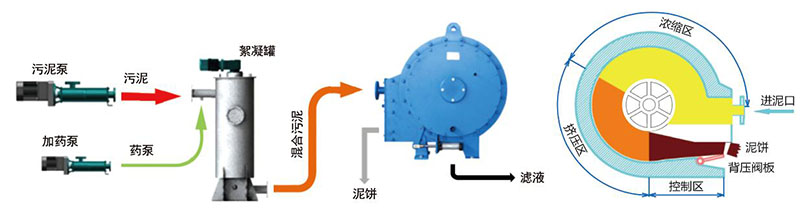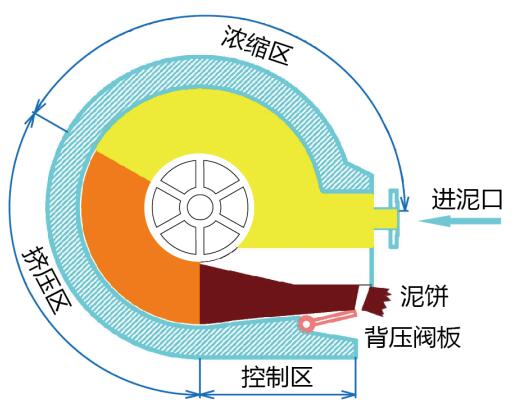 含泥污水通过药剂调理后进入污泥通道,污泥在环形的通道内被钻有小孔的滤板低速带动,随着通道容积逐渐收缩,水分从两侧滤孔排出。在进口推力和滤网摩擦力的作用下,污泥不断被推向出口,由于末端挡门提供可调节背压,使更多水分被挤出,在达到脱水目的后污泥由挡门开口处不断排出。